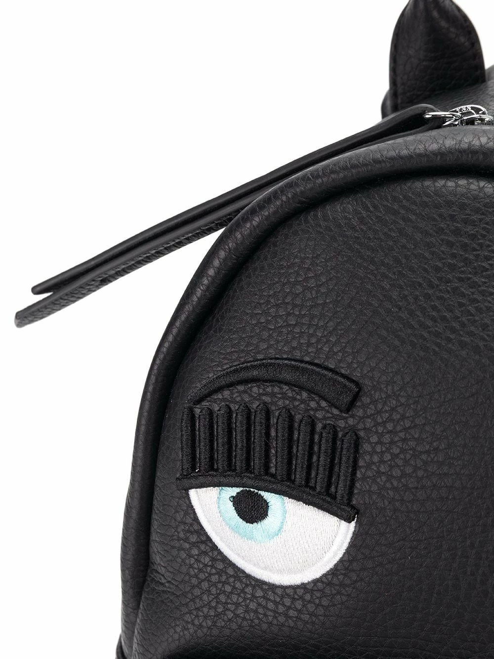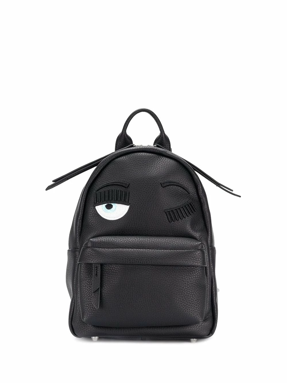 Chiara Ferrgni, a fashion designer who started as a “Blond Salad” blogger presenting a lifestyle of the most fashionable pieces. Nowadays she is a well known luxury creator with a somewhat girly and funky flow, injecting with an extraordinary Italian chic. This black eye design backpack from Chiara Ferragni featuring leather straps, front zipped compartment and main zipped compartment .