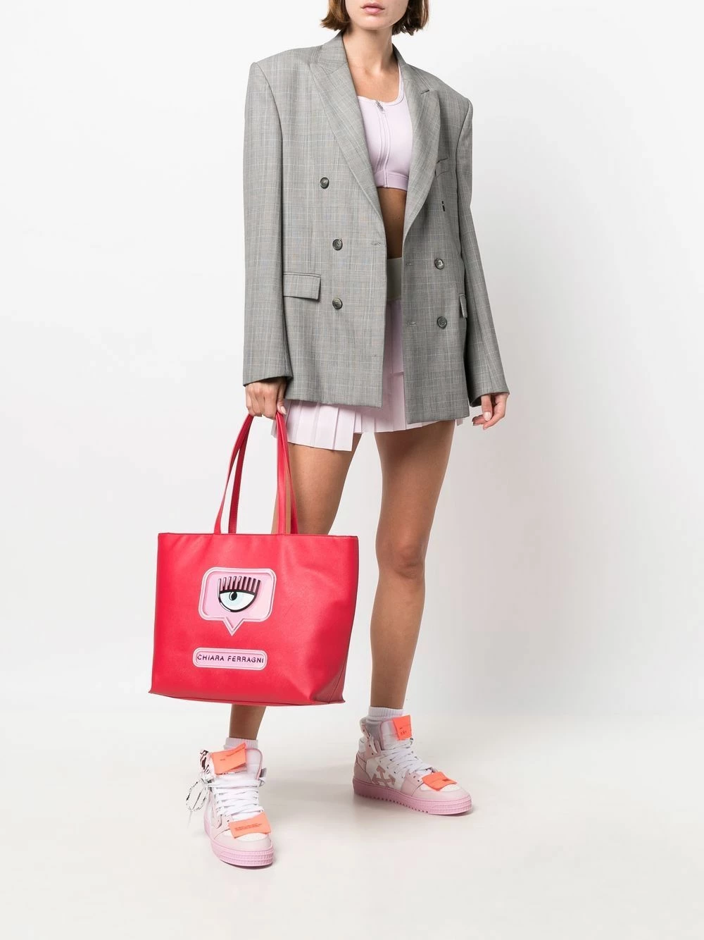 Chiara Ferragni’s instantly recognisable winking eye motif decorates the front of this versatile faux-leather shoulder bag for AW21. In a pleasing red and pink hue, the practical accessory boasts a top zip fastening and spacious main compartment.