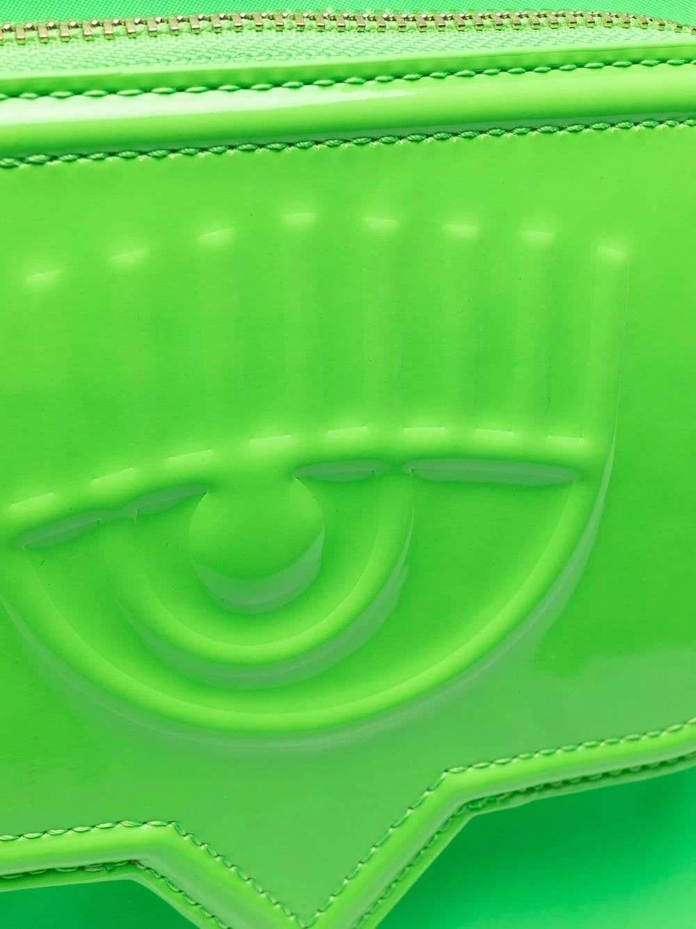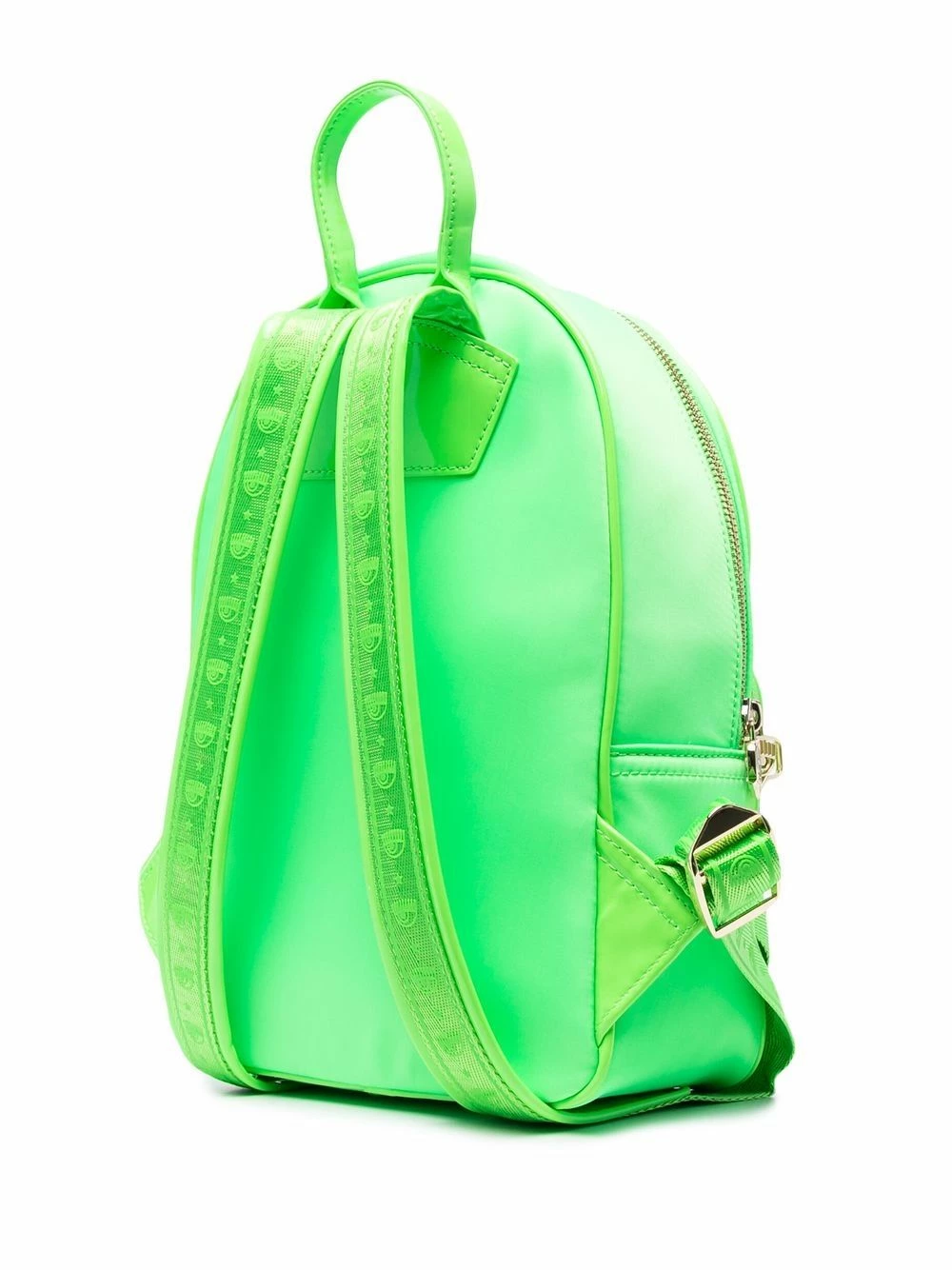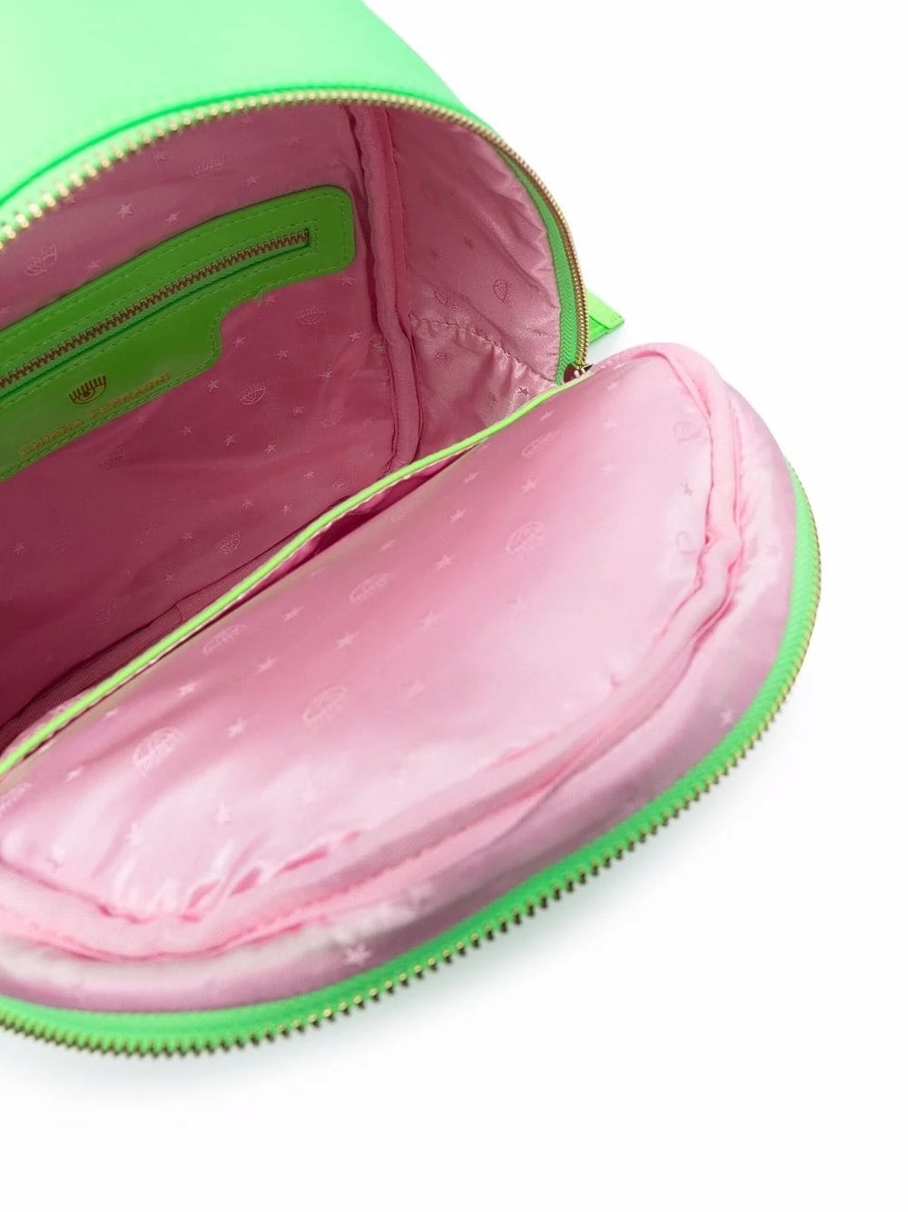 Chiara Ferragni decorates this bright green mini backpack with her signature Eyelike motif. Boasting a central zip pocket and a contrasting pink logo print lining, it is an elevated choice for a practical offering.
