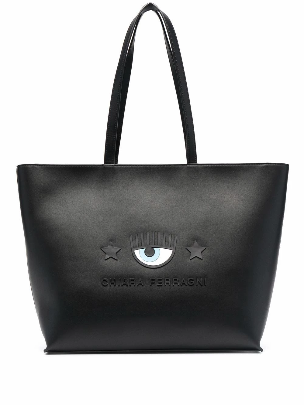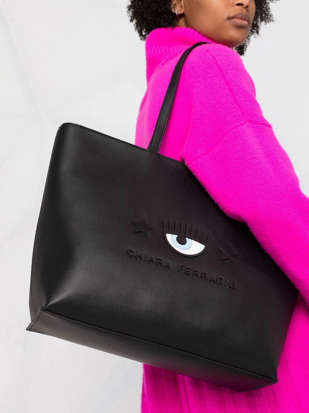 ย Renowned for their cartoon eye logo decorating the brand’s creations, Chiara Ferragni presents this black eyelike logo shoulder bag with a bold print to the front.