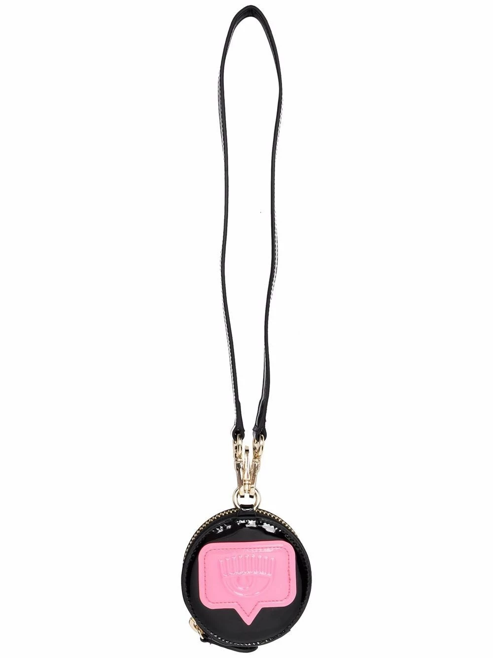 Strung from a detachable neck strap, Chiara Ferragni’s compact mini circular purse is detailed with the label’s iconic eye motif. Presented in a versatile black hue with pink detailing, the playful accessory opens top reveal an internal coin pocket.